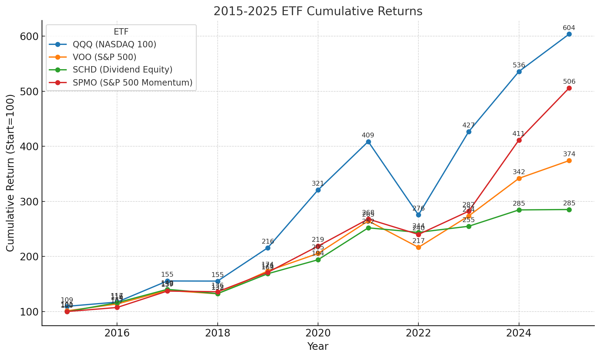 이번 글에서는 2015년~2025년 동안의 QQQ, SPMO, VOO, SCHD 4개 ETF 누적 수익률을 비교하고, 각 ETF의 특성과 투자 적합성을 분석합니다.